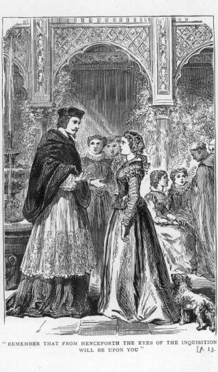 “Ah, Doña Mercia, I find that your daughter is a little heretic, and holds in but slight respect the doctrines of the Church. As she tells me she was instructed in them by her late father, and as he must have imbibed such abominable principles during his visits to Germany from that arch-heretic Luther, I trust that they have proceeded no farther. But let me advise you to be cautious, Doña Mercia, and to inculcate Catholic principles into the mind of your daughter. Remember that from henceforth the eyes of the Inquisition will be upon you.”