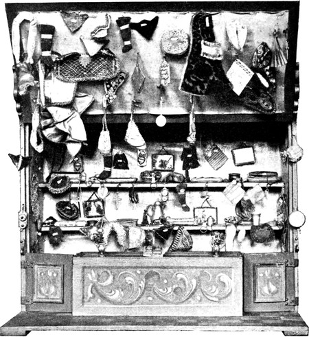 Tracht und Schmuck: Anhängetasche aus Schweinsleder mit vielen Abteilungen und geknoteten Verzierungen; 16. Jahrh. Silberne Gürtelkette; Nürnberger Arbeit; 16. Jahrh. Damenkostüm aus rot- und weißgestreifter Seide nebst breitrandigem Strohhut, Tasche aus blauer Seide, Strümpfen, Handschuhen u. s. w., im ganzen 17 Stücke; um 1830. Damenstrohhut mit grünen Bändern und grünweißem Tüllbesatz; 1820–40. Weißbaumwollene Frauenhaube (Kappe) aus Montafon; Anf. des 19. Jahrh. Zu demselben Costüm gehören: weißbaumwollener Frauenunterrock, weißbaumwollenes hoch geschlossenes Frauenhemd mit weiten Ärmeln, Haarband mit Haarschnur aus roter Seide, Halsbinde, Leible, aus schwarzer Seide, verschiedene Bänder, Brautkrone aus Gold- und Silberflitter und künstlichen Blumen, Stecker aus schwarzem buntgemustertem Sammt, grünes Miedertuch, schwarzwollener Frauenrock mit daran befindlicher Taille.