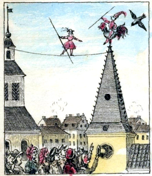 6Det war en lindansare, som hade spännt upp ett tåg emellan kyrktornet och klockstapeln och på det tåget hoppade en liten goße och en liten flicka och dansade mot hwarandra och gjorde förunderliga swängningar. Jaså, tänkte tuppen, war det inte annat? hwad bryr jag mig om sådant pjoller?