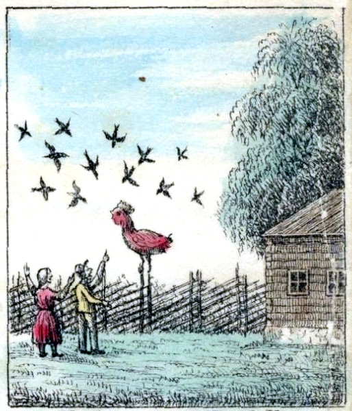 Men förnämt folk har stundom rätt ledsamt, och det hade ochså kyrktuppen. Flyga kunde han inte, arbeta wille han inte och äta behöfde han inte. Det war ej utan, att han ju ibland med en wiß afund betraktade prostens höns, som någongång trippade ända fram till tornfoten och krafsade så behändigt upp sanden och plockade sig ett och annat korn.