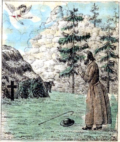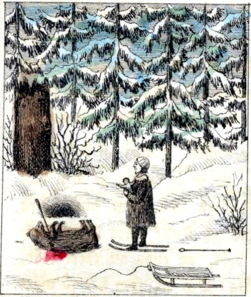 Men med Lochteå fattiggubben är det en egen historia, och den skall jag berätta. I socknen bodde fordom en gammal inhysing, wid namn Pietari, wanligen kallad Puu-Pietari eller Träd-Peter, emedan han war en utomordentligt trädslög man, som kunde med sin lilla tälgknif utskära de förunderligaste saker, icke allenast hästar åt bondpojkarne, utan jemwäl fläkterörnar, gripar, dockor och allehanda konstiga figurer. Men i sitt hjerta war Puu-Pietari en sniken och arglistig man, som icke tänkte på annat, än att samla pengar på hwad sätt som helst. Ja han war så girig, att han under en sten i skogen hade nedgräft en skatt af flera hundrade riksdaler i silfwer och guld, hwilken han samlat dels genom trädslöjd, dels 28genom tiggande under många år; men deraf wißte ingen, emedan den gamle skalken utwärtes ställde sig såsom den allrafattigaste usling, med hwars trasor och magerhet hwarochen hade medlidande.