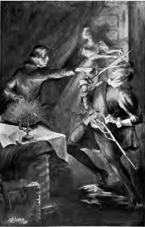 He was slender in stature and slightly above medium height. His dress was of the extreme style of the period; but although rich in texture, was worn with much use, and stained from evident dissipation. The black cloak, with buff silk lining, was torn across one shoulder. The scarlet doublet, because of missing buttons, was open more than its maker intended, to show the vest of same color, and gayly embroidered shirt front. The belt around the doublet was enriched with 15 silver cord, and held a long rapier, whose bejeweled hilt was enough to excite the cupidity of vagrants or rufflers. The trunk hose of black fabric, reaching half way down his upper leg, was slashed so as to admit the protruding of purple silk, while tights of the latter color extended from the bottoms of the trunks down into the low shoes. He wore a flat cap with single white feather, and under it a mass of black hair hung to his shoulders.