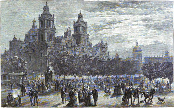 | CHAPTER X. | The Cathedral of Mexico.—Site of the Aztec Teocalli.—Human Sacrifices.—Panorama of the Valley of Mexico.—Extent and Cost of the Cathedral; Chapels and Altars.—Tomb of Iturbide.—The Career and Tragic End of Iturbide.—The Richest Altar in the World.—Golden Candlesticks a Man could not Lift.—The Aztec Calendar-stone; its Interesting Features; Inscription on the Stone.—Brief Account of the Aztecs.—The Tribe called Mexicans.—Aztec Laws and Customs.—Prevalence of the Death Penalty.—Aztec Posting System.—Picture-writing.—Flower-show in the Zocalo.—A Fashionable Assemblage.—Wonderful Work in Feathers. |