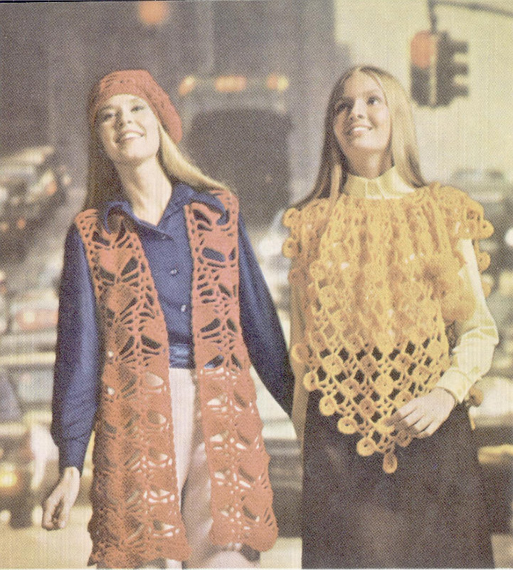 Skirt directions are given for small to medium size. Changes for medium to large size are given in parentheses. Different size hooks are used for vest. (See gauge.)